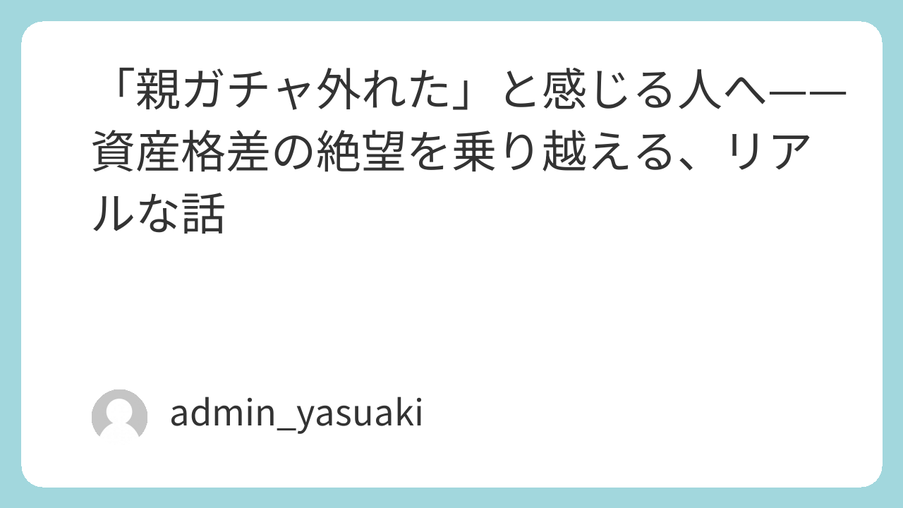 「親ガチャ外れ」という感覚は、完全に正しい認識です。資産格差は実在するし、不公平も実在する。その事実を否定する気は一切ありません。
