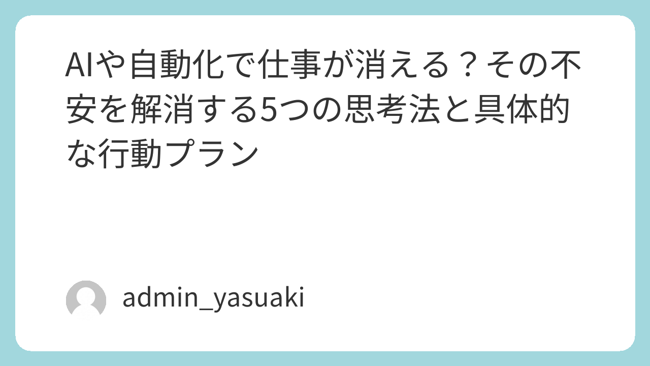「AIが怖い」という漠然とした不安は、分解すると「①自分の今の仕事が5年後に存在するか心配」「②新しいスキルを身につける時間も余裕もない」「③何を勉強すればいいかわからない」という具体的な問いに分かれます。