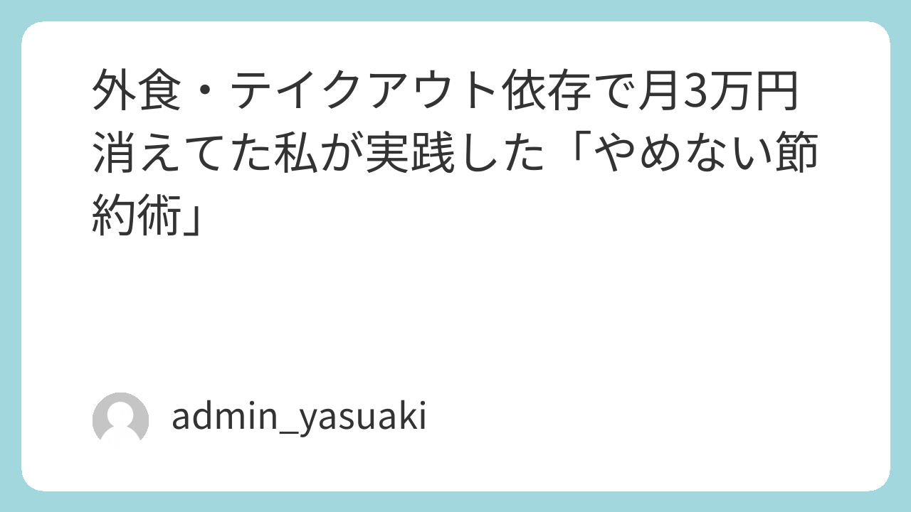 月のインパクト: テイクアウト夕食(週3回 × 1,200円)を週1回に減らすだけで、月約9,600円の削減。