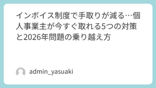 🌸悩み解決 インボイス制度で手取りが減る…個人事業主が今すぐ取れる5つの対策と2026年問題の乗り越え方 インボイス制度で手取りが減った個人事業主向けに、売上別の納税額シミュレーションと2割特例終了後の対策を解説。2026年12月の届出期限など今すぐやることがわかります。 2026.04.01 🌸悩み解決