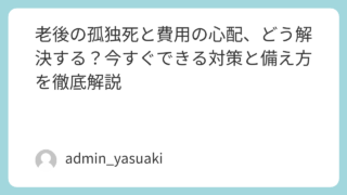 🌸悩み解決 老後の孤独死と費用の心配、どう解決する?今すぐできる対策と備え方を徹底解説 孤独死の平均後処理費用は約76万円。発見が遅れるほど費用は跳ね上がります。月770円の見守りサービスから死後事務委任まで、家族への負担を最小化する今すぐできる対策を解説。 2026.04.01 🌸悩み解決