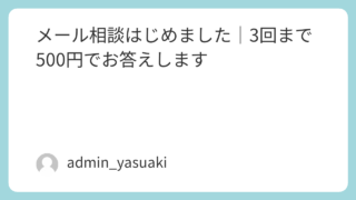 ブログでは書きにくい個別の悩みをメールで相談できます。暮らし・お金・副業などの疑問に、3回まで500円でお答えします。完全な解決を保証するものではありませんが、考え方や方向性のヒントをお伝えします。お気軽にご相談ください。